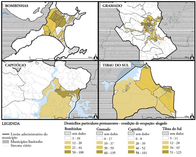 Os dados sobre a distribuição espacial e predominância dos mercados de aluguel de longa duração e de curta duração foram obtidos através do Censo Demográfico Brasileiro de 2010 realizado pelo IBGE. O primeiro mercado de aluguel levantado corresponde aos “domicílios particulares permanentes – condição de ocupação: alugados”, na classificação oficial do Instituto. O segundo, refere-se ao mercado de aluguel de curta duração representado pelos “domicílios particulares permanentes não ocupados - uso ocasional”, também na classificação oficial do IBGE. Na definição do Instituto entende-se essa última classificação como “domicílio particular permanente que, na data de referência, servia ocasionalmente de moradia. Ou seja, são aqueles usados para descanso de fins de semana, férias ou outro fim, mesmo que, na data de referência, seus ocupantes ocasionais estivessem presentes” (IBGE, 2010a, p. 210).