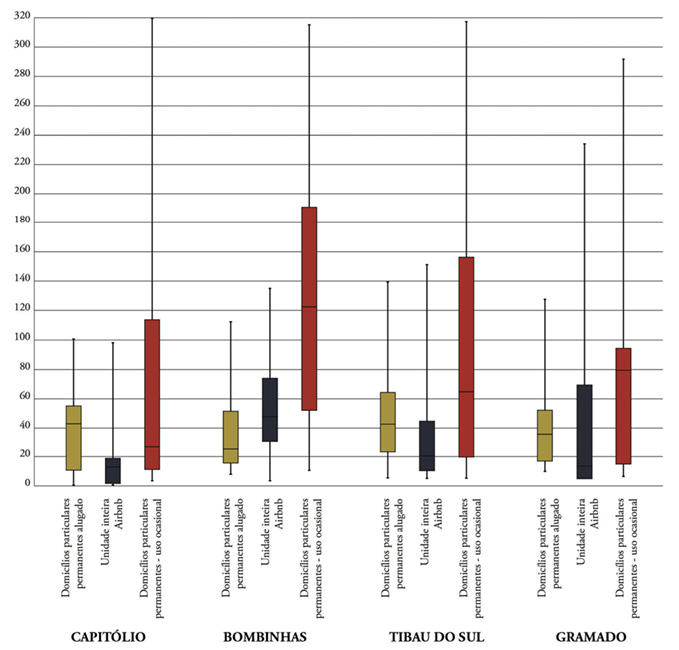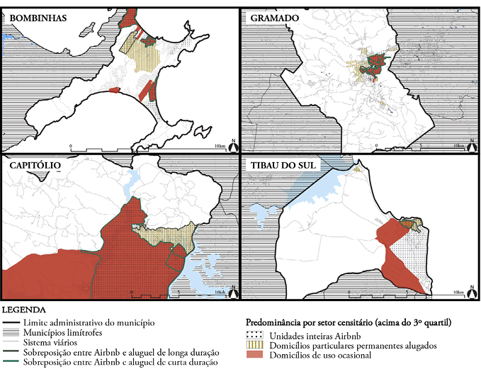 A caracterização das cidades investigadas permitiu perceber a prevalência do Airbnb nessas cidades em que já havia um turismo de lazer consolidado: em Gramado desde 1922, Capitólio por volta de 1975, com a construção da represa, Bombinhas, 1970 e Tibau do Sul desde 1930. Mas não só isso, cidades com uma tradição de hospedagem em casas de veraneio e/ou segundas residências, portanto com soluções de hospedagem tipo aluguel de curta duração anterior à chegada do Airbnb. Nota-se a importância de inserir a variável mercado de aluguel de temporada – além do mercado de aluguel permanente – para real compreensão do fenômeno Airbnb nessas cidades.