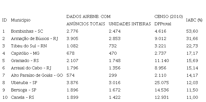 Para esta pesquisa, a definição dos municípios a serem objeto de análise empírica partiu de levantamento no próprio site Airbnb.com através de web-scrapping e de dados do Censo Demográfico Brasileiro de 2010.
