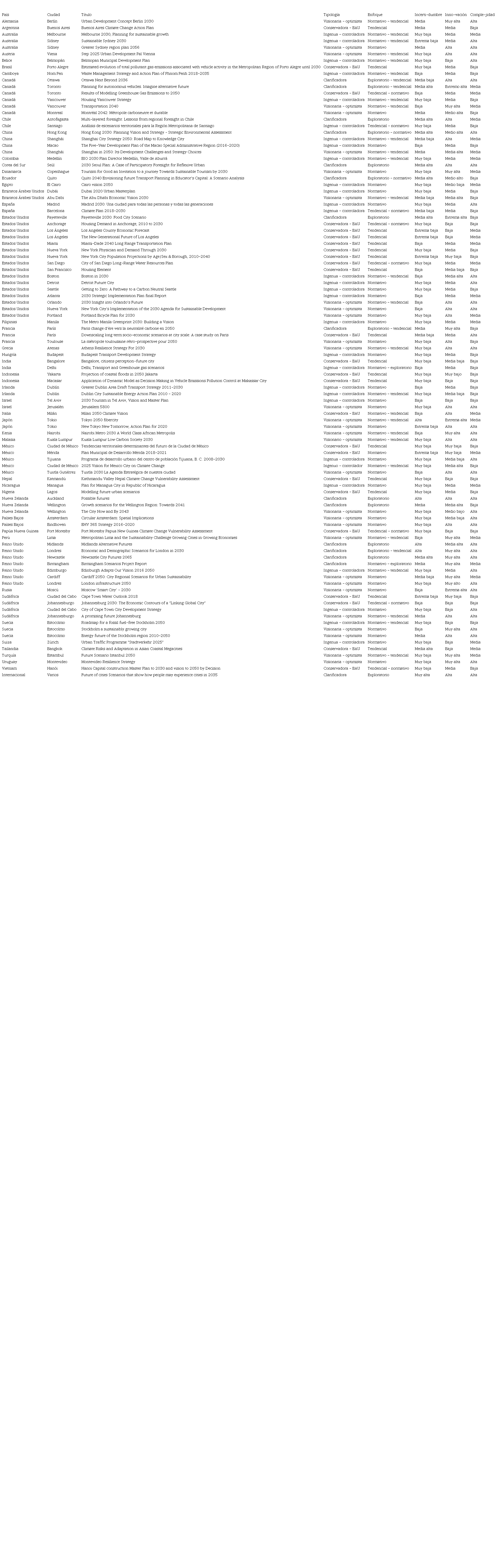 Para el análisis y caracterización de la construcción institucional de los futuros de las ciudades, se montó una base de datos compuesta por un corpus de 101 documentos, en cada uno de los cuales se representa una versión del futuro de ciudades seleccionadas (Tabla 1, al final del artículo). Se optó por escoger documentos de lo que se conoce como “literatura gris”, que contienen escenarios futuros de ciudades elaborados entre 2005 y 2019. Estos documentos cumplen con los siguientes criterios: 1) presentar un escenario explícito sobre el futuro de una aglomeración urbana; 2) exponer la metodología utilizada en la construcción del futuro; y 3) delimitar un umbral temporal y territorial.
