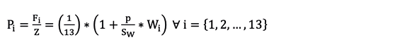 donde Pi corresponde a la proporción del monto del FNDR (Z) por distribuir entre las regiones que va a la región i, Fi es el monto que recibirá la región i. Los parámetros p y Sw están asociados a la varianza de las variables que determinan la asignación, y no afectan la distribución de una región en particular, sino que sirven para incrementar o suavizar las diferencias de asignación entre las regiones que resultan de las variables utilizadas en el algoritmo. En este caso p se fijó por ley en 0,15 y eventualmente podía variar entre 0,1 y 0,2, mientras que Sw correspondía a la desviación estándar de la variable Wi, que corresponde a la suma de los vectores de variable socioeconómico (S) y la variable territorial (T):