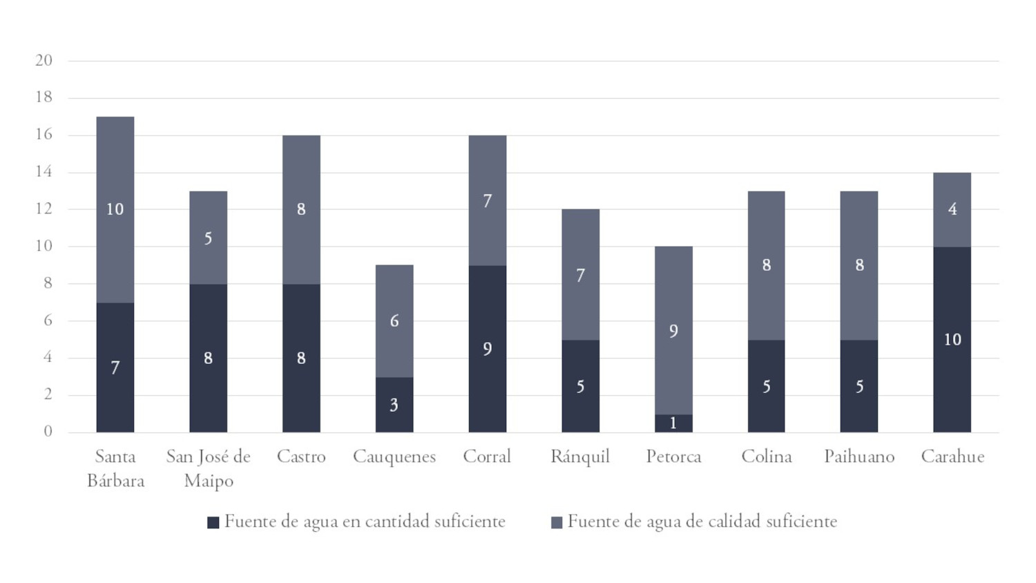 Si tomamos el caso de las localidades con niveles medios de seguridad hídrica, los procesos difieren. En el caso de “Castro”, representativo de localidades rurales aisladas y en pérdida de dinamismo organizacional abastecidas por una entidad del “Grupo de organizaciones pequeñas”, los problemas provienen de fallas en la calidad del servicio otorgado, un bajo nivel de conocimientos técnicos y pocas redes de apoyo, así como de la falta de solidez en la gestión económica de la organización. En el caso de “Colina”, que representa al “Grupo de organizaciones grandes”, que son asociadas al Programa APR, que por cambio de uso de suelo se sitúan en áreas periurbanas densamente pobladas, la escasez se explica por problemas en el manejo del servicio que no logra otorgar agua en cantidad suficiente, por la fragilidad económica de la gestión comunitaria y por un acceso insuficiente a los recursos hídricos. En el caso de “Santa Bárbara”, representativa de aquellas localidades dispersas que reciben agua por organizaciones apoyadas por financiamiento regional (SUBDERE), la escasez proviene de la falta de solidez institucional de la organización. Los dirigentes no cuentan con conocimientos suficientes ni redes de apoyo, y tampoco logran realizar una gestión económica sólida y otorgar un servicio de agua en cantidad suficiente a la población.