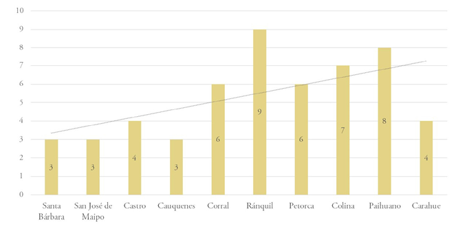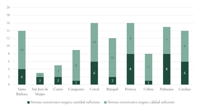 Si observamos la Figura 3, vemos que los casos con niveles más altos de conocimiento y redes de apoyo compensan procesos hidrosociales más delicados, como son las dificultades para acceder a recursos hídricos suficientes (“Petorca”) o para otorgar agua en cantidad suficiente a la población (“Ránquil” y “Colina”). Sin embargo, en los casos que están en una posición de inseguridad hídrica no se observa esta compensación. Es de interés subrayar que en los casos con resultados altos (“Ránquil”, “Paihuano”, “Colina” y “Corral”), el análisis de discurso revela la iniciativa y los esfuerzos por parte de los dirigentes para buscar apoyos externos contactando actores situados a distintos niveles (actores institucionales, universitarios, privados, uniones de APR, etc.). En ese sentido, la capacidad de las dirigencias de obtener estos apoyos es un elemento fundamental de la seguridad hídrica y proporcional al tamaño de la organización.