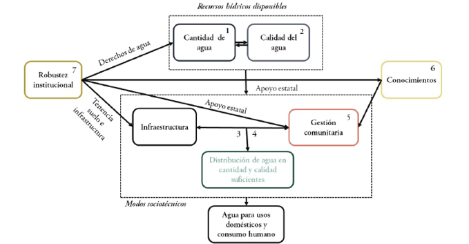 A continuación, presentamos los elementos que componen la definición conceptual de la seguridad hídrica en la interfaz doméstica-comunitaria y su traducción metodológica a un indicador compuesto. Nos apoyamos en un diagrama que permita visualizar las relaciones que se establecen en este constructo (Figura 1). Para que la población rural conectada a una red de distribución obtenga agua en cantidad y calidad suficientes para su consumo, se imbrican siete procesos hidrosociales que definen los modos sociotécnicos de distribución del agua desde el punto de captación colectivo hasta la conexión domiciliaria. Los dos primeros procesos reflejan la posibilidad para una organización de acceder a recursos hídricos en cantidad (n° 1) y calidad (n° 2) suficientes, a nivel de la microcuenca abastecedora de agua ya sea subterránea o superficial. Los procesos hidrosociales n° 3, n° 4 y n° 5 describen la gestión del servicio de distribución por las organizaciones hasta las conexiones domiciliarias, asegurando cantidad, calidad y continuidad. El n° 3 muestra los factores que permiten una gestión del sistema sociotécnico que asegure la cantidad, mientras el n° 4, la calidad de la misma. El proceso hidrosocial n° 5 establece la solidez económica de la gestión comunitaria. Los procesos n° 6 y n° 7 revelan las relaciones de las organizaciones con otros actores situados a distintas escalas. El proceso n° 6 describe el nivel de apoyo y conocimientos para el mantenimiento del servicio. El último proceso hidrosocial, el n° 7, se refiere a la robustez jurídica e institucional de la organización y su posibilidad de proyectarse a futuro en el marco de la aplicación de la ley sobre los Servicios Sanitarios Rurales (SSR),3 obteniendo la licencia para seguir operando.