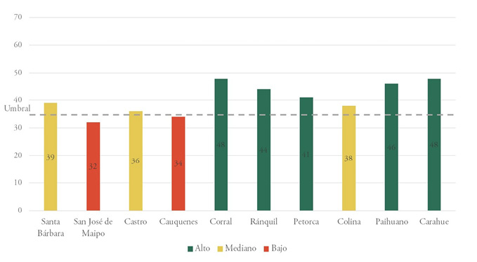 Para aplicar el indicador compuesto a los diez casos de estudio, se tradujo el instrumento en una pauta de entrevista con preguntas que permitían indagar sobre la presencia, ausencia, frecuencias y evidencias de cada variable. Luego se realizaron 22 entrevistas semiestructuradas a los/as dirigentes/as de cada organización entre septiembre de 2019 y enero de 2020, las cuales se complementaron con 23 entrevistas a habitantes de los respectivos sectores y observaciones en terreno. Después, se procedió a una codificación por variable en ATLAS-TI y se analizaron los discursos, con el objetivo de asignar una nota a cada una de las variables. La suma de las notas de cada variable genera una nota por indicador secundario. La suma de las siete notas genera una nota final de nivel de seguridad hídrica por caso (sobre un máximo de 70). El umbral de seguridad hídrica se establece en la nota media de 35 puntos. Esto se define con base en la valoración cuantitativa de cada variable, que a su vez está asociada a una pregunta de la pauta de entrevistas, donde las notas mínima y máxima reflejaban expresiones extremas de (in)seguridad hídrica, siendo la nota promedio una situación intermedia. Por encima o por debajo de ese umbral, la probabilidad de que surjan expresiones de la seguridad o inseguridad es mayor. Al interpretar el umbral también es relevante considerar la distribución del puntaje entre los indicadores secundarios, dado que la calificación puede alcanzar 35 o más puntos, pero concentrados en pocos indicadores, lo que puede evidenciar inseguridad hídrica por ausencia total de otros indicadores. En ese sentido, se trata de un umbral heurístico y no absoluto, en tanto permite reflexionar sobre la situación relativa de una organización en relación con sus condiciones particulares frente a las variables hidrosociales, y no persigue comparar o jerarquizar las organizaciones entre sí.