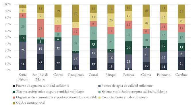 Estos resultados señalan que no se observa una correlación directa entre el tamaño de las organizaciones y su nivel de seguridad hídrica. De acuerdo con la muestra, pareciera que en los casos donde las organizaciones llegan a un tamaño mediano, se daría más probabilidad de obtener un mejor acceso al agua potable. Otro resultado evidencia que el adherir al Programa de APR no garantiza una seguridad hídrica elevada a la población. Si bien el grado de informalidad de la organización o el hecho de no estar adscrita al Programa de APR puede incidir negativamente en el nivel de seguridad hídrica, a la luz de los resultados de los casos “San José de Maipo” y “Santa Bárbara”, el adherir al Programa tampoco garantiza un nivel de seguridad hídrica alto, como lo revelan las situaciones de los otros casos, en particular los de “Cauquenes”, “Castro” y “Colina”. Para entender qué procesos explican las diferencias observadas entre los niveles de seguridad hídrica de cada uno de los casos, es importante analizar la incidencia (en porcentajes) de cada subelemento en los resultados totales del Indicador Compuesto (Figura 3).