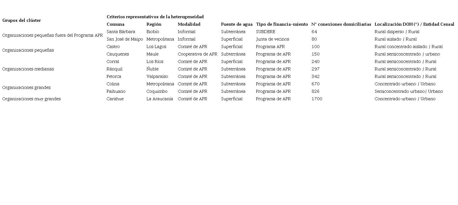 La descripción y cuantificación de los modos de acceso produjo varios hallazgos, que permitieron definir los criterios representativos de la heterogeneidad: 1) La mayor parte de la población rural tiene acceso al agua mediante una organización adscrita al Programa de APR (un 70%). Las cooperativas son menos frecuentes. 2) Siguen organizaciones formales no adscritas al Programa. 3) Existen organizaciones comunitarias en espacios considerados urbanos. Como el 70% de la población tiene acceso al agua mediante una organización adscrita al Programa, se aplicó un análisis de clúster a la base de datos de servicios comunitarios de agua rural usando la variable “n° de conexiones domiciliarias” como criterio de agrupación. Se identificó cuatro clústeres homogéneos, aunque diferentes entre sí: Grupo de Organizaciones Pequeñas (947, lo que representa el 48%), Medianas (683, representando un 35%), Grandes (294, que constituyen el 15%) y Muy grandes (38, con solo un 2% del total). Cada clúster presenta una variabilidad interna en los aspectos que se consideraron para caracterizarlos (tipo de administración, fecha de creación, concentración, latitud, longitud, y variables climáticas). La distribución de la variabilidad dentro de cada grupo fue utilizada como criterio para seleccionar los casos. Es decir, la selección de casos dentro de cada grupo se realizó calculando percentiles de las variables siguientes: Número de conexiones domiciliarias (n), Año de inicio (año), Elevación (msnm), y Precipitación anual (mm). Esto permitió representar adecuadamente la diversidad de organizaciones al interior de cada grupo.