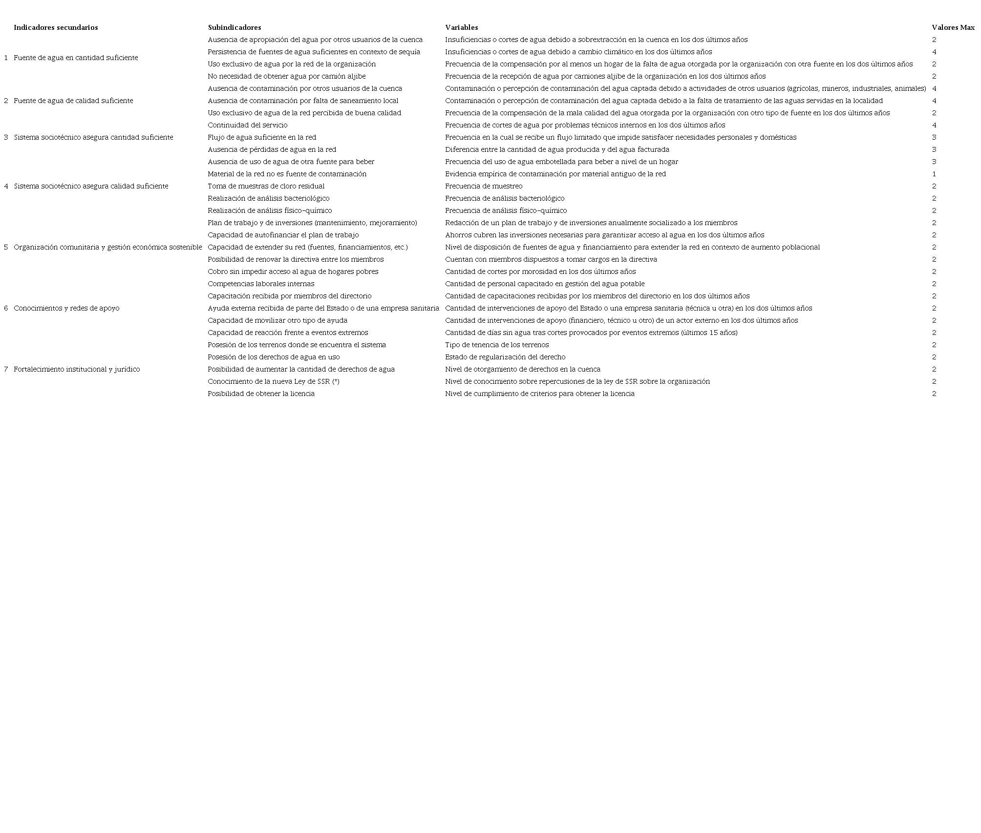 Para entender los procesos que inciden sobre el nivel de seguridad hídrica en cada caso de estudio, se procede a una operacionalización que permite aplicar mediciones empíricas a los distintos procesos identificados en la definición conceptual, creando así un indicador compuesto (Tournier, 2015). En la Tabla 2 se muestra la traducción de los siete procesos hidrosociales de la definición conceptual en siete indicadores secundarios, que componen el indicador compuesto. Se acordó asignar a cada indicador secundario (IS) un puntaje máximo equivalente a 10 puntos, considerando que cada proceso tiene un peso semejante en la seguridad hídrica. Este supuesto permite no orientar de manera preliminar la investigación y distinguir en los resultados el peso de cada variable en los niveles de seguridad hídrica. Sin embargo, se creó una cantidad pertinente de variables por indicador secundario, a las que se asignó una ponderación al otorgarles, analíticamente, una nota entre 2 y 4, donde 0 expresa una situación de inseguridad hídrica y la nota máxima, una situación de seguridad hídrica. Las variables y sus ponderaciones respectivas fueron elegidas a partir de la revisión de la literatura y revisadas por un panel de cinco investigadores/as con experticia en temas de escasez hídrica, hidrología y calidad del agua en contextos de comunidades rurales. Además, se aplicó el instrumento de manera piloto en una organización comunitaria, tres de cuyos miembros hicieron retroalimentaciones.