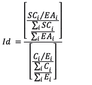 En segundo lugar, se ha calculado el índice de peso cooperativo comunal para representar la participación relativa de las cooperativas agropecuarias en las comunas chilenas respecto a la presencia de empresas agrícolas formales (no cooperativas). El índice es una adaptación del conocido cociente de localización (Valiente, 2019), aplicado a las siguientes variables: (SC) número de socios de cooperativas agrícolas; (EA) número de trabajadores en empresas agrícola; (C) Cooperativas agrícolas; (E) Empresas agrícolas. Este trabajo considera que conforme el índice esté más cercano a 1, existe un mayor peso cooperativo comunal, mientras que cuando lo valores se acerquen a 0, el peso cooperativo será menor (Ecuación 2):