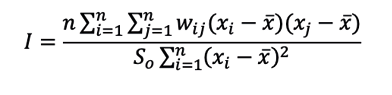 donde n es el número de comunas chilenas, xi y xj y son los atributos de interese de la variable x – número de cooperativas agrícolas; x ̅ es el valor promedio; wij es el valor de vecindad normalizado, de acuerdo con la matriz W de pesos espaciales considerada en el estudio; S0 es la suma de los wij elementos de la matriz simétrica W. En este estudio, nosotros hemos considerado la matriz de 5 vecinos (k = 5). Como estrategia de robustez, hemos testeado con otros matrices W.