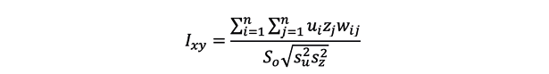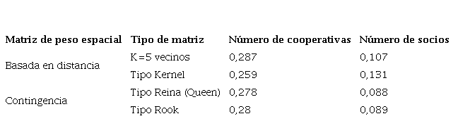 Para estimar la relación espacial entre el número de cooperativas agrícolas y la presencia de cooperativas económicamente importantes, se estimó el índice bivariado de Moran (Ixy) (Anselin & Arribas-Bel, 2013). El I Moran bivariado viene dado por: