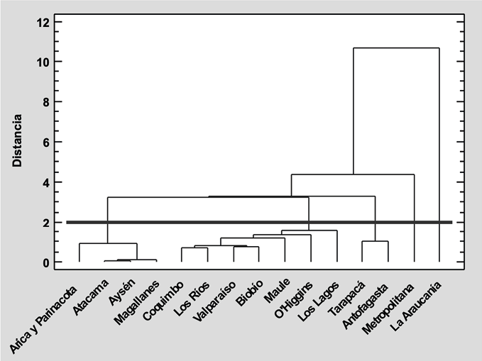 Una vez realizado el análisis, se ha generado un dendograma fijándose la distancia euclidiana en 2 para determinar el número de grupos en que se puede clasificar el cooperativismo a nivel regional. Se toma la elección de una distancia relativamente corta como 2, debido al bajo número de casos estudiados (las 17 regiones de Chile). Esta distancia permite generar grupos homogéneos que compartan características regionales parejas, facilitando discernir las regiones que tienen una situación peculiar y conocer cómo es la realidad regional del cooperativismo agrícola en el país.