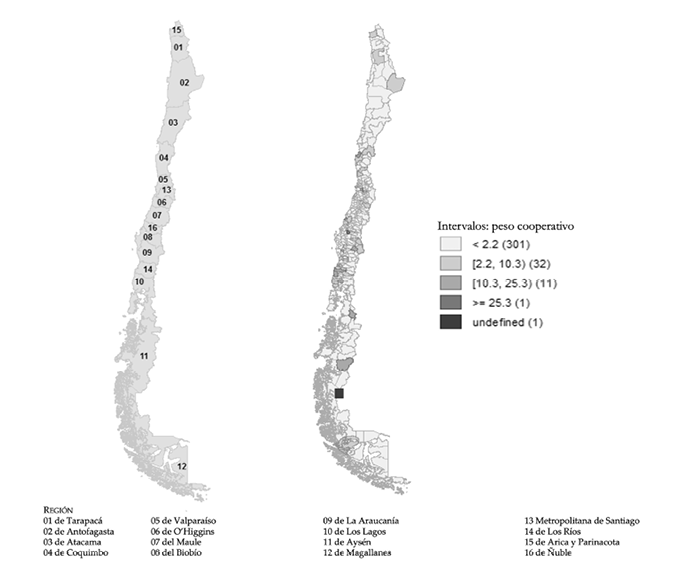 La Figura 2 muestra los resultados a nivel comunal del índice de peso cooperativo con cuatro grupos desagregados (cuatro niveles). Los colores más claros indican un menor peso relativo de la actividad cooperativa a nivel local, mientras que los colores más oscuros indican mayor presencia de las cooperativas agrícolas en relación con las empresas formales del mismo rubro. En general, se observa que no existe un patrón claro de actividad de agrupación cooperativa, que se concentra en algunas zonas del país, principalmente en el sur.
