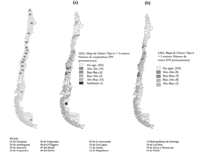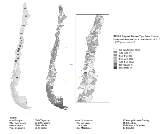 El patrón opuesto se identifica en la Región de La Araucanía, donde, a pesar de la concentración de cooperativas, algunas comunas no siguen este patrón. Se identifican comunas Altas-Bajas (13) y Bajas-Altas (2), en las que los vecinos tienen una baja presencia de cooperativas agrícolas, lo que indica un cierto grado de aislamiento de la actividad cooperativa. Además, también puede ser posible confirmar la hipótesis de la dependencia espacial en la distribución geográfica de las cooperativas agrícolas, en las que las áreas del norte y el extremo sur no presentan regiones económicas en actividad cooperativa. En general, la estadística LISA confirma la autocorrelación espacial en dos áreas principales del cooperativismo agrícola chileno. El primero se encuentra en la región centro-norte de Coquimbo alrededor de la cooperativa de IE CAPEL, mientras que el segundo está en la región centro-sur de Los Ríos, alrededor de la cooperativa de IE COLUN.