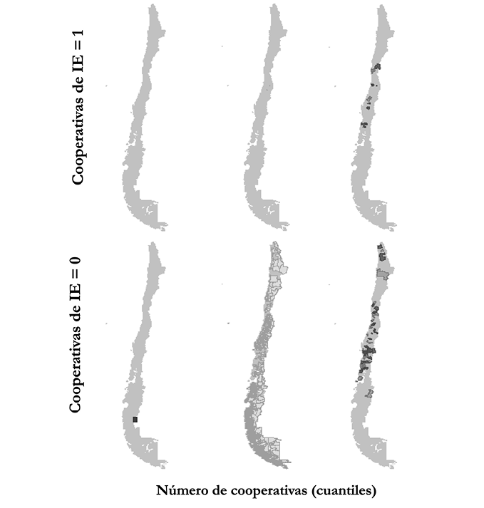 Como se discutió en la sección 2, las cooperativas de IE pueden ser importantes en la promoción del cooperativismo local. La Figura 4 muestra la distribución del número de cooperativas agrícolas en comunas (cuantiles) condicionadas a la presencia o no de cooperativas de IE. Aunque el hecho de que una comuna determinada tenga más cooperativas no implique tener una cooperativa de IE, lo contrario no es necesariamente válido. Es posible, por ejemplo, que una concentración espacial de cooperativas no tenga ningún tipo de relación intrínseca con la presencia de una organización de IE. En este sentido, el mapa superior derecho da cuenta de una presencia significativa de grupos cooperativos alrededor de las comunas con cooperativas de IE. Este patrón sugiere que puede existir alguna relación entre la presencia de cooperativas de IE y el surgimiento de clústeres cooperativos en territorio chileno.