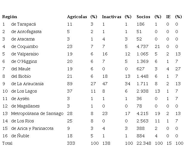La Tabla 1 muestra el número total de cooperativas agrícolas activas e inactivas, y el número de miembros, en todas las regiones chilenas. La mayor concentración regional de cooperativas está en las regiones de La Araucanía (27%), Los Lagos (11%), Los Ríos (8%) y Región Metropolitana de Santiago (8%). En cuanto a las cooperativas inactivas, se puede observar una distribución regional similar. Sin embargo, el patrón regional es diferente cuando se observa la distribución del número de miembros. Hay una mayor concentración de socios en regiones del norte de Chile, como Coquimbo, que agrupa al 21% de todos los socios de cooperativas del país; la siguen las regiones Metropolitana de Santiago (19%), Los Lagos (13%) y Los Ríos (12%), en las cuales se encuentra más del 80% de las cooperativas de IE del país.