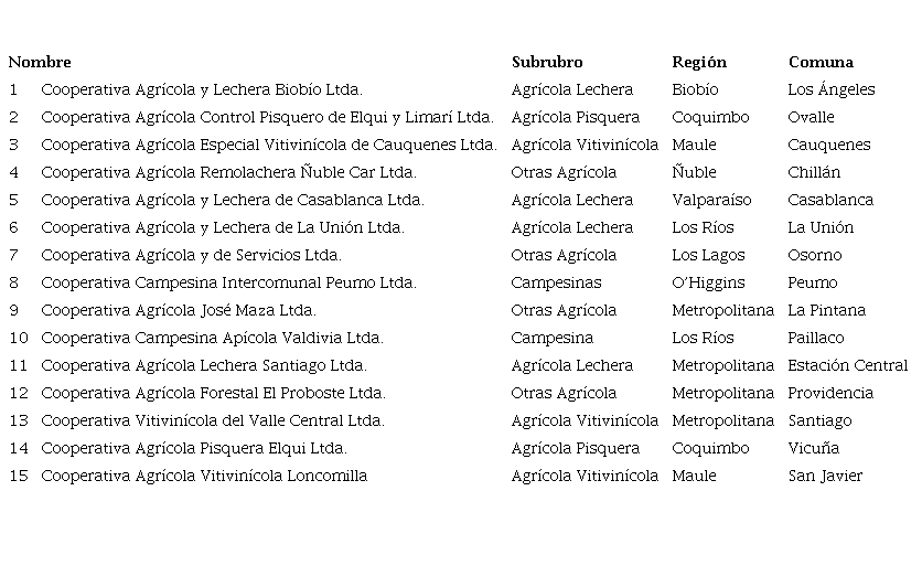Chile tiene un sistema de clasificación para sus cooperativas agrícolas basado en una categorización legal según su tamaño, donde aquellas de gran tamaño son denominadas cooperativas de Importancia Económica (IE), que incluyen aquellas con un patrimonio superior a 5.000 Unidades de Fomento (UF). Estas empresas pueden desarrollar un papel importante en la consolidación de sistemas de redes cooperativas generadoras de clústeres. Según información de DAES (2021), en el país existe un total de 15 cooperativas de IE agrícolas, que representan 5,3% del total de cooperativas agrícolas del país. La mayoría se concentra en la Región Metropolitana de Santiago (31,5%), Región del Maule (15,4%) y O’Higgins (12,8%), mientras que existen varias regiones del país que no albergan cooperativas agrícolas de IE. Respecto a las cooperativas de IE del rubro agrícola, destacan la Cooperativa Agrícola y Lechera de La Unión (COLUN), la segunda empresa agrícola más importante a nivel nacional, que aporta casi el 76% de la producción de lácteos en las regiones de Los Ríos y Los Lagos; y la Cooperativa CAPEL, que produce más del 51% del total de la industria pisquera en Chile (Tabla 2).