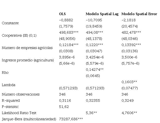 en que yi representas el total de socios de cooperativas en cada i , y X es una matriz que incluye el número de empresas agrícolas y el promedio de los salarios de los empleados agrícolas (nominales), y una variable ficticia que indica la presencia de cooperativas de IE. Dos estimaciones incluyen el término ‘dependencia espacial’ para tener en cuenta el papel geográfico en la determinación del tamaño del cooperativismo de membresía a nivel comunal. En este caso, la matriz de pesos espaciales utilizada fue del tipo Queen. El término ui representa el término residual, que es la diferencia entre el valor observado y el valor estimado, que pueden no ser capturados por el conjunto X de variables explicativas.