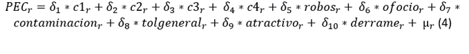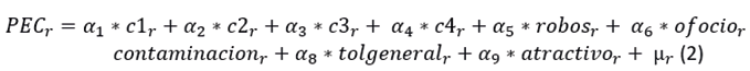 El tercer modelo añade efectos derrame, que permiten contemplar el ámbito espacial y examinar en qué medida existen transferencias entre regiones de industrias creativas. Este aspecto es relevante dada la elevada concentración de este tipo de industrias en el territorio, que puede llevar a efectos negativos (una menor presencia de industrias creativas) en las regiones próximas a grandes centros creativos. Para ello se calcula la matriz de distancias entre los centroides de cada región (y se multiplica por el vector con la variable PEC). La matriz de distancias entre regiones (D) se obtiene empleando “eudistance” (Kurbucz & Katona, 2022). La distancia entre dos regiones actúa como medida de proximidad y, por lo tanto, de la capacidad de influencia. Puede emplearse para calcular los ponderadores, para lo que se extrae el valor más elevado de la matriz D (m), y se divide esta matriz por el valor de dicho escalar. Los efectos derrame se calculan como el producto de esta matriz y del vector de la variable PEC. Como resultado de estas operaciones se obtiene un vector (derrame) que mide cómo influye a otras regiones la presencia de industrias creativas en una región, considerando que la influencia es mayor en las más próximas.