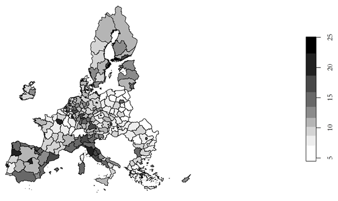 La Figura 1 muestra la distribución asimétrica de la variable creativa en territorios de las regiones europeas, lo que resulta coherente con la literatura existente.