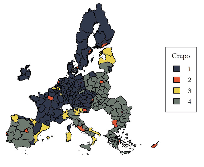 El primer grupo (color gris oscuro) es el más numeroso, compuesto por 116 regiones, principalmente del centro y norte de Europa. El segundo grupo (color naranja) comprende la mayoría de las regiones en las que se encuentra la capital nacional (21 regiones), aunque existen ciertas excepciones, y se observa una alta dispersión geográfica. El tercer grupo (color amarillo) contiene, exclusivamente, regiones con lengua propia (22 regiones). El último grupo (color verde grisáceo) comprende mayoritariamente regiones del este y del sur de Europa (71 regiones).