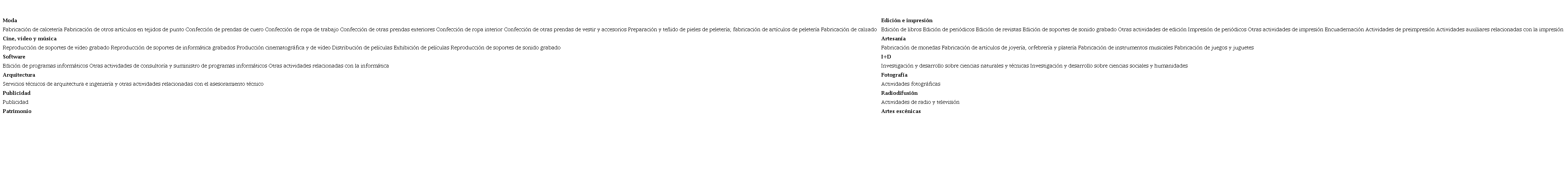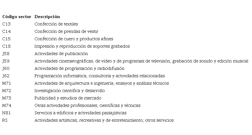 Las industrias creativas se componen de sectores considerablemente heterogéneos, los cuales comparten el que la creatividad de sus trabajadores constituye su principal fuente de riqueza. En el ámbito europeo, la clasificación realizada por Sánchez-Serra (2016) supone un buen punto de partida, debido a que se elabora con base en los sectores de la Clasificación Nacional de Actividades Económicas (CNAE). La Tabla 1 presenta los sectores que se incluyen en dicha clasificación.