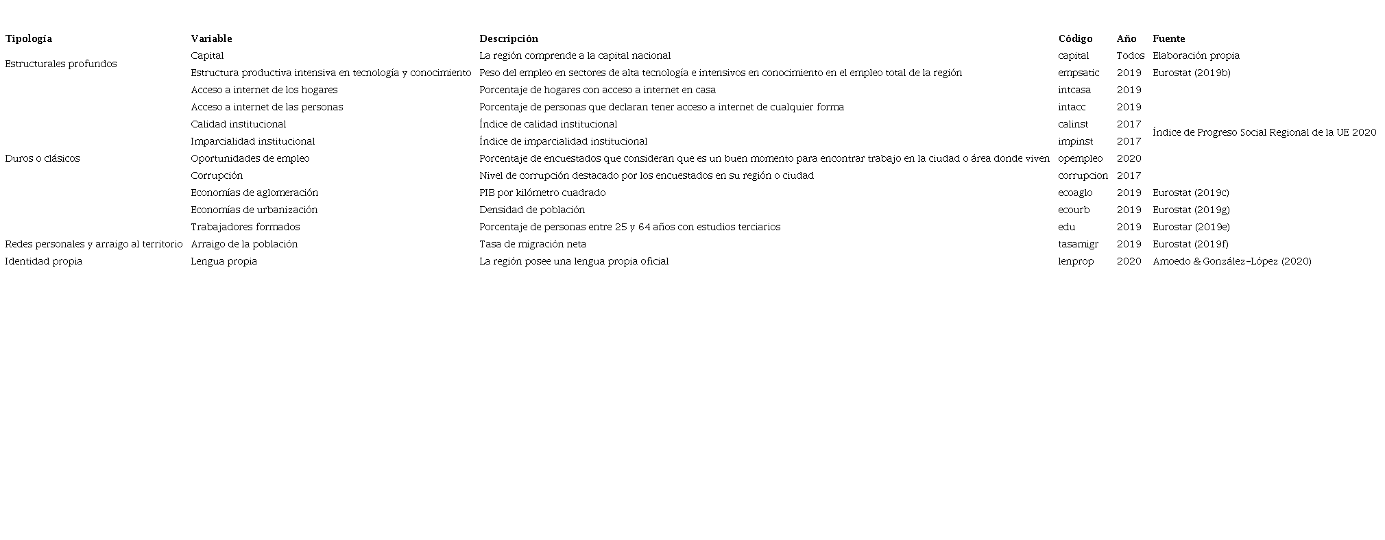 En segundo lugar, se selecciona un grupo de variables que miden la dotación de determinados factores duros, estructurales profundos, ligados a las redes personales, y el arraigo al territorio y la identidad propia en las regiones analizadas. Estos factores se miden a través de las variables recogidas en la Tabla 4.