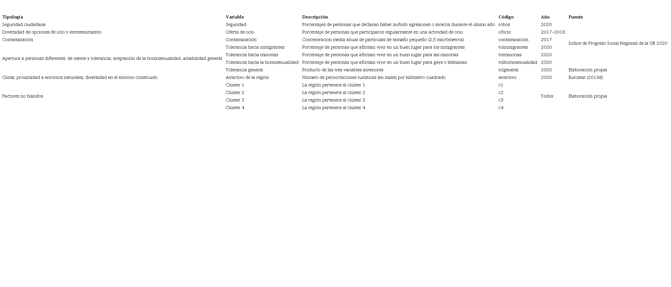 En tercer lugar, el último grupo comprende las variables que miden la dotación de determinados factores blandos en las regiones analizadas y las cuatro variables dummy obtenidas del análisis de clústeres. Las variables empleadas para medir estos factores se recogen en la Tabla 5.