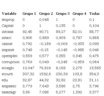 Para un mayor conocimiento de las características de cada grupo, resulta de interés observar el valor medio de las variables empleadas para realizar el proceso de agrupamiento. La Tabla 6 muestra estas medias.
