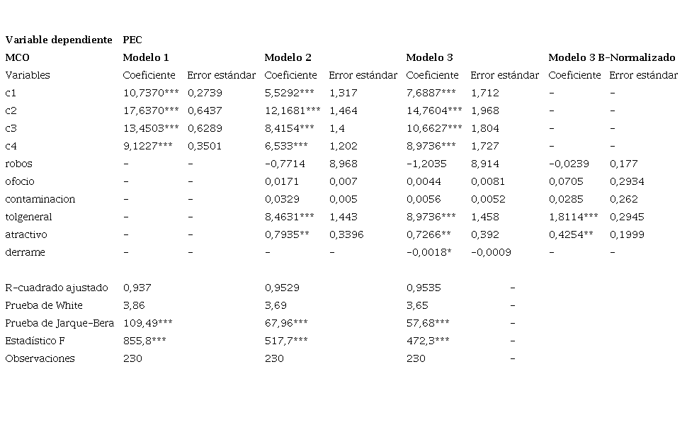 Las estimaciones poseen buenas propiedades. El coeficiente de determinación ajustado (R2 ajustado) muestra que el ajuste es bueno y mejora al añadir variables explicativas. No existen indicios de heterocedasticidad, como muestra la prueba de White (López-Pérez, 2020), pues se acepta la hipótesis de homocedasticidad con los cinco niveles de significación señalados en tres estimaciones. Los residuos cumplen el supuesto de normalidad en las tres estimaciones, como muestra la prueba de Jarque-Bera. El estadístico F señala significatividad conjunta para las tres estimaciones realizadas. Adicionalmente, se incluyen los coeficientes estandarizados para el tercer modelo, lo cual permite observar cuáles tienen una mayor relevancia.