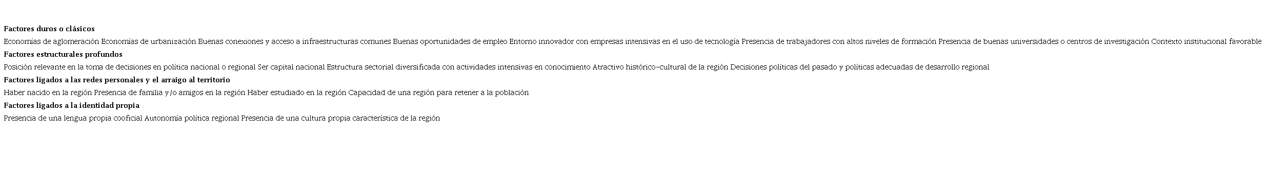 La literatura analiza diversas tipologías de factores que explican la concentración de industrias creativas. Aunque no existe una clasificación homogénea, estos factores pueden ordenarse en cinco categorías. El primer grupo incluye los factores clásicos o duros (Murphy & Redmond, 2009; Stryjakiewicz, 2010) y está compuesto por los aspectos que tradicionalmente explican la concentración de la actividad económica y población común. El segundo grupo recoge los factores ligados a redes personales y el arraigo al territorio (Murphy & Redmond, 2009; Musterd & Gritsai, 2013), que muestran la capacidad de un territorio para generar lazos personales vitales. El tercer grupo está conformado por los factores ligados a las condiciones estructurales profundas (Bontje et al., 2011; Musterd & Gritsai, 2009), entre los que se incluye la relevancia en la toma de decisiones de la región a nivel nacional e internacional, así como la senda de desarrollo seguida en el pasado. En cuarto lugar, se encuentran los factores ligados a la identidad propia (Amoedo & González-López, 2020), que recogen la presencia de una cultura distintiva y característica del territorio y la autonomía política. El quinto grupo se compone de los factores blandos (Murphy & Redmond, 2009; Stryjakiewicz, 2010), que recogen aspectos ligados a la capacidad del territorio para generar un clima social amigable y atractivo para los individuos creativos. Entre los factores blandos más relevantes destacan la tolerancia, el acceso a vivienda de calidad, una buena oferta de ocio y cultura, un entorno natural atractivo en la proximidad o un clima amigable.