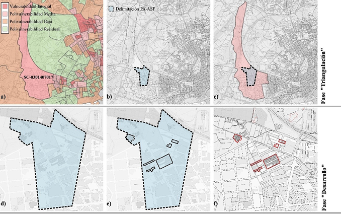 Como se muestra en la Figura 6, en este caso la superposición permitió distinguir dentro de la SC-0301407017 el ámbito realmente importante en relación con la vulnerabilidad urbana, descartándose una gran superficie destinada a la industria, los equipamientos o el uso rural, para focalizar la atención en los enclaves identificados por el PA-ASF.
