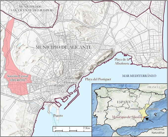 La puesta en práctica de la metodología de análisis que se propone en esta investigación utiliza la ciudad de Alicante, en la Comunitat Valenciana (CV), como caso de estudio (emplazamiento detallado en la Figura 1). Su elección se justifica por la existencia tanto de estudios de vulnerabilidad urbana cuantitativos para toda la región, como cualitativos centrados en algunos barrios de Alicante. Con estos antecedentes, es posible realizar una aproximación mixta sustentada en resultados previos, pudiendo contrastar los mismos a partir de distintos métodos de trabajo.