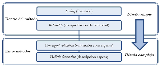 Con anterioridad a estas reflexiones, Jick (1979) considera todos los casos como triangulación, dentro de la cual aprecia grados. Distingue triangulación “dentro del método” y “entre métodos”. El primer tipo se basa en la comprobación cruzada de la coherencia interna, mientras que el segundo pone a prueba el grado de validez externa. La integración entre enfoques se considera una gradación continua que va desde diseños simples a complejos. Como se muestra en la Figura 3, en el extremo más simple tenemos el scaling o cuantificación de medidas cualitativas. Algo más sofisticada, aunque aún “dentro del método”, es la comprobación de fiabilidad. Ya en el enfoque “entre métodos”, la convergent validation considera que usar métodos complementarios conduce a resultados cada vez más válidos. El método más complejo implica lo cualitativo de forma destacada, hasta el punto de que se utiliza como contrapunto crítico de lo cuantitativo (Figura 3).