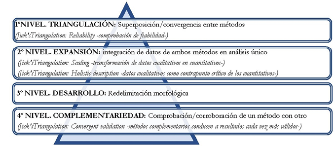 De la revisión de los estudios sobre vulnerabilidad que combinan enfoques, se deduce que cada método de integración otorga diferentes pesos a uno u otro. Con base en esta idea y combinando la visión reciente sobre integración de enfoques de Muñoz (2013) y Mendizábal (2018) con la gradual de Jick (1979), estimamos cuatro niveles en cuanto a la intensidad de la integración. El primero correspondería a la mayor integración entre lo cuantitativo y lo cualitativo y el último a la menos intensa (Figura 4).