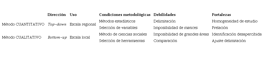 La decisión de usar uno u otro enfoque responde a consideraciones teóricas de cada investigación. Siempre existe posibilidad de decisión, pero cada fórmula ofrece ventajas e inconvenientes que condicionan la elección. La investigación a escala local (bottom-up) suele basarse en trabajo de campo e interacción con las comunidades y goza de mayor acercamiento a la realidad y calidad delimitativa. Sin embargo, es difícilmente generalizable, replicable y, sobre todo, comparable entre municipios de tamaños y capacidad de gestión diferentes, dificultando establecer prelaciones en el reparto de fondos.