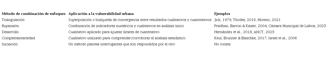 En relación con el análisis de la vulnerabilidad urbana, se ha observado que los autores que han combinado los enfoques cualitativo y cuantitativo recurren a diferentes métodos. Como se observa en la Tabla 2, es posible encontrar estudios de vulnerabilidad urbana que recurran a las mencionadas formas de combinar enfoques, a excepción de la conocida como ‘Iniciación’, de la que no se ha localizado ninguna referencia concreta.
