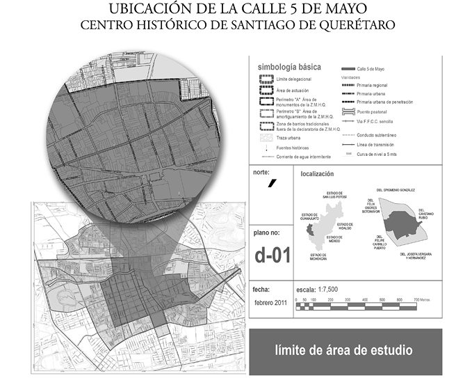 Para ejemplificar lo hasta aquí señalado, se muestra el caso de la calle 5 de Mayo del CH de Querétaro, la cual se encuentra en la ZMH y es conectada por la avenida Circunvalación (Figura 1), arteria de desfogue y enlace de tránsito vehicular que también representa una frontera cultural de tiempos y monumentos.
