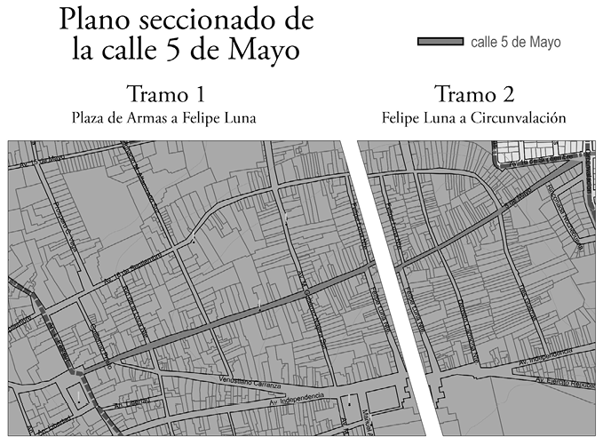 Este tramo de la calle 5 de Mayo comienza su intensidad en la esquina que hace con la calle Felipe Luna y encuentra su finalización en la Plaza de Armas. Desde la calle de Felipe Luna –pero ahora en sentido inverso a Plaza de Armas– hasta la avenida Circunvalación, se desenvuelve el segundo tramo (Figura 2). Aquí la frontera entre un tramo y otro sucede tan pronto brotan los cables y postes de luz, al tiempo que se extinguen las banquetas en buenas condiciones, los depósitos para basura, los jardines y jardineros. Sin embargo, ahí germinan las tienditas de la esquina con venta de abarrotes, panaderías y, sobre todo, viviendas.