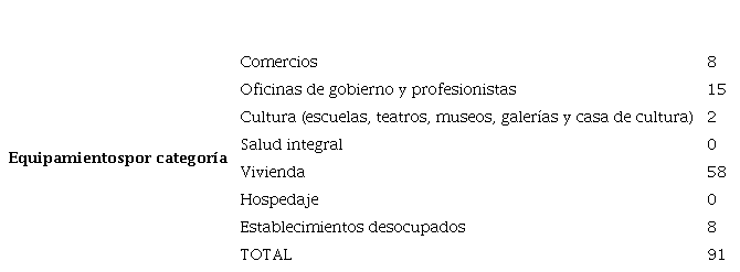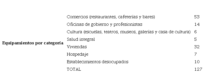 Lo anterior, en términos porcentuales, significa que los comercios representan un 44,16% de los espacios construidos; las viviendas, un 26,66%; las oficinas de gobierno y negocios de profesionistas, el 11,66%. Es en este tramo donde se encuentra la mayor oferta de espacios culturales, los cuales –a excepción de la Casa de Cultura y las escuelas– están atendiendo principalmente a los visitantes.