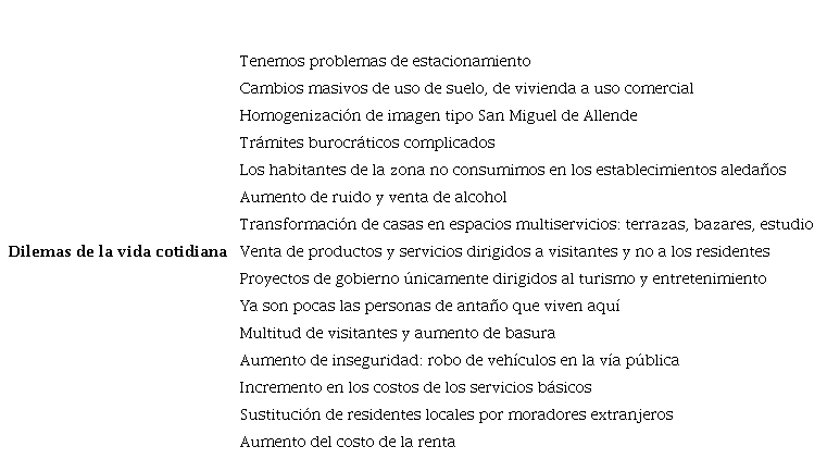 La Tabla 3 aborda expresiones testimoniales provenientes de la voz de los interlocutores. En ella se registra lo que es nombrado, normalizado y normado a través de los conflictos y resistencias en que los residentes se ven a diario envueltos ante la creciente presencia del marketing turístico, la industria inmobiliaria y los intercambios económicos.