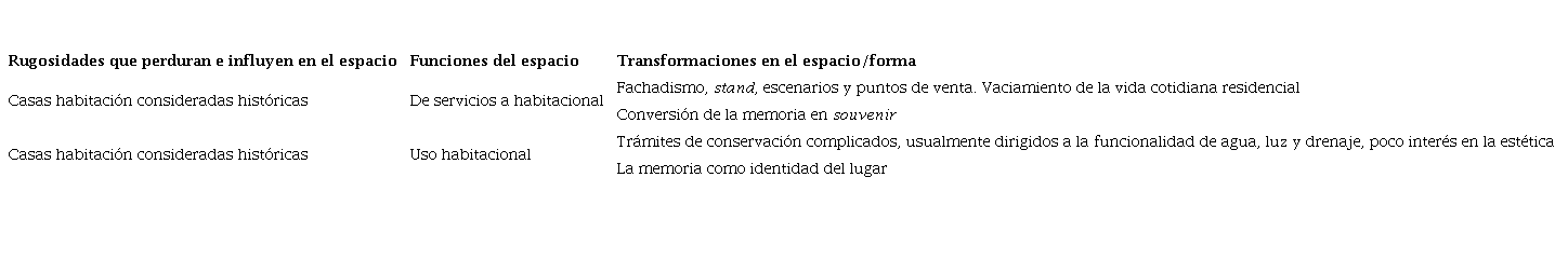 Finalmente, la Tabla 4 da cuenta de los cambios en el espacio y su funcionamiento. En ella incluimos la perspectiva de Santos (1990) sobre las rugosidades en el espacio social, misma que describe el modo en el cual las transformaciones en el uso de suelo van modificando las funciones en el espacio, lo que permite observar las consecuencias directas en el espacio construido. Así, mirar y analizar los acontecimientos a través de las rugosidades en su dimensión morfológica (espacio/forma) y socioeconómica (funciones) permite caracterizar los CH patrimonializados en sus propios términos históricos, geográficos, económicos y culturales.
