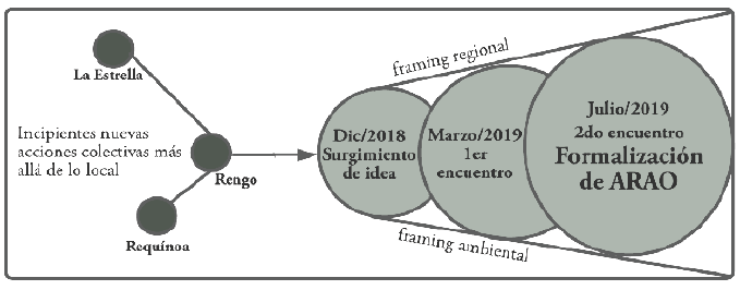 En la etapa de origen, es posible corroborar que principalmente la H3 explica el fenómeno, ya que la construcción de un nuevo marco de acción colectiva fue clave para la articulación regional de la movilización ambiental. En cuanto a la H2, respecto a la implementación de un renovado repertorio de acciones, se evidencia que contribuyó al proceso, pero en menor medida y de forma complementaria a la H3. Es decir, el enmarcamiento regional en torno a una idea organizadora fue la principal propulsora de la articulación, y también la base para la puesta en práctica de renovadas tácticas que superaban la escala local. Respecto a la H1, si bien hubo una lectura de las oportunidades políticas del entorno, estas no fueron determinantes para el origen de la articulación regional. La Figura 2 sintetiza el proceso, con particular énfasis en el enmarcamiento, en sus dimensiones tanto ambiental como regional.