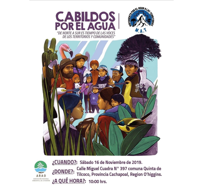 En ambas actividades participó el MAT. La cumbre les sirvió para promocionar el recién inaugurado proceso de cabildos por el agua que estaban llevando adelante desde el 7 de octubre de 2019. Este proceso tenía por objetivo visibilizar y problematizar sobre la tenencia y gestión del agua, pero, además, en términos estratégicos del movimiento, los cabildos les sirvieron para incluir a nuevos aliados, así como socializar, educar y politizar (Larocque et al., 2021). ARAO se acopló a este proceso, siendo la segunda región que más realizó cabildos ligados al MAT en plena revuelta social, coorganizados con agrupaciones locales de las tres provincias. El proceso culminó con la participación de integrantes de ARAO en un encuentro del MAT (taller; Facebook de ARAO, 2020) (Figura 5).
