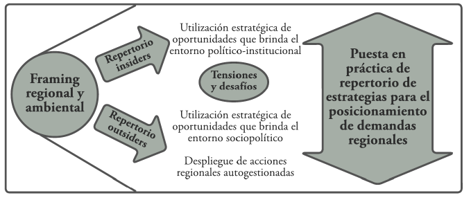 De esta manera, es posible corroborar que los cambios en la estructura de oportunidades políticas fueron los principales propulsores en el desarrollo de la articulación regional, facilitando la puesta en práctica de un renovado repertorio de estrategias y el continuo enmarcamiento regional y ambiental. Es decir, la H1 es la que explica principalmente el fenómeno y, si bien se evidencia que las H2 y H3 contribuyeron al proceso, estas fueron complementarias a la primera. La Figura 7 sintetiza el proceso, con particular énfasis en las tácticas y estrategias desplegadas.