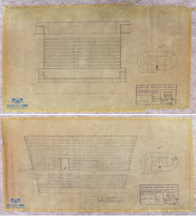 A pocos días del terremoto que asoló Valdivia, Carlos Dittborn tuvo reuniones con los representantes del gobierno y la Junta de Adelanto de Arica, la que se mostró dispuesta a colaborar para cumplir con los plazos que la organización del mundial establecía. Para 1961, Estadio publicaba los costos de la construcción del estadio, que ascenderían a los “Cuatrocientos mil dólares”, suma que permitiría la construcción de un inmueble para albergar a una multitud de “25 mil personas en cada reunión” (Estadio, n° 953, 31 de agosto de 1961). En la nota se hacía una directa alusión al impacto que iba a tener en la población la obtención del recinto. Para la Junta de Adelanto, la construcción del estadio no fue una tarea superficial, pues contaron con instrumentos técnicos y una serie de planos para tales efectos (Figura 2).