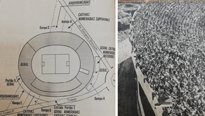 El deporte cumplía un rol económico y social de importancia para las instituciones brasileñas. El fútbol por encima de todo (Da Matta, 1982; Helal, 1997). Esto se reflejaba en eventos de importancia, como el que se dio el domingo 27 de junio de 1971, cuando se buscó batir récords en el estadio Morumbi de São Paulo con el partido entre el São Paulo y el Palmeiras por el título del Campeonato Paulista de 1971 (Figura 4). El equipo São Paulo venía como el favorito, pues solo necesitaba de un empate para alcanzar el título, mientras que el Palmeiras estaba obligado a ser el vencedor. La renta de dicho partido se calculó sobre el millón de cruzeiros (631 mil cruzeiros en ingresos vendidos al viernes, sin contar los ingresos recaudados el día del partido), con 139.964 entradas vendidas y 11.000 lugares gratuitos para menores de 14 años y autoridades. “Un récord absoluto en todo el país”, informaba la prensa. Debido a la magnitud del cotejo, el partido se transmitió por televisión y fue necesaria la participación de 266 soldados de la policía militar para contener la considerable población que se movía del recinto deportivo a la ciudad (Folha de São Paulo, n° 15.351, 27 de junio de 1971). El equipo de São Paulo finalmente ganó el partido por la cuenta mínima, logrando una recaudación máxima de Cr$913.916,00 (Folha de São Paulo, n° 15.352, 28 de junio de 1971).