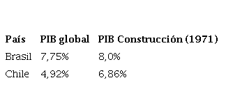 En términos macroeconómicos del PIB (en el sector constructor), para inicios de la década de 1970, países de la región como México (10,0%) y Argentina (5,4%) tuvieron tasas de crecimiento elevadas en el sector, al igual que países del tercer mundo como Corea del Sur (10,5%), Malasia (10,0%), Tailandia (8,3%) y Egipto (6,9%) (Botelho, 2007; Briones & Riquelme, 2023; Rakodi, 1992; Riquelme, 2023a; Santos, 2012, 2019). Tanto en el caso de Chile, con un 6,86%, como el de Brasil con 8,0%, se experimentó un ascenso considerable del sector constructor en el PIB (Tabla 1).