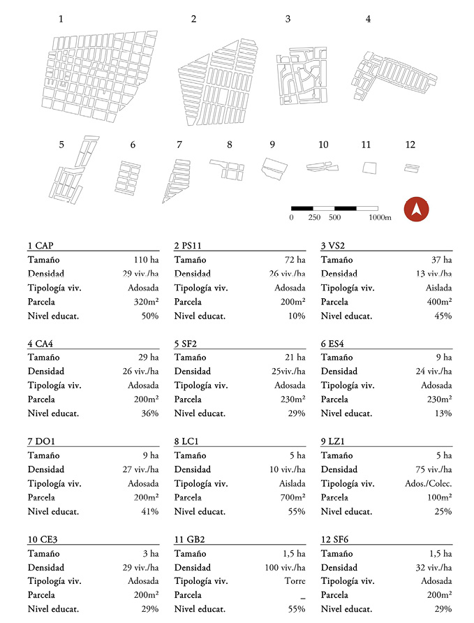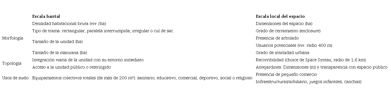 Por otra parte, se caracterizó el entorno construido de las doce unidades, el cual se conforma como la variable independiente. Para hacerlo, se utilizó un esquema que cruza dos escalas, la barrial y la local, con tres aspectos básicos: morfología (la forma de los elementos), topología (las relaciones espaciales entre elementos) y usos del suelo (Tabla 2).