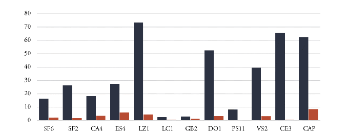 Los resultados obtenidos muestran, en la gran mayoría de los casos, vitalidades bajas o muy bajas, tanto en referencia al flujo peatonal como a la cantidad de gente que realiza actividades estacionarias. La media de todas las calles es de 30 transeúntes por hora, valor que se sitúa próximo a los 40 transeúntes que, en Londres, Hillier y Sahbaz (2005) establecieron como típicos de una calle con muy poco tránsito peatonal. En el caso de las plazas, la media es casi idéntica, con 29 peatones por hora. La permanencia es también baja, con cifras de entre 0 y 4 usuarios en los tramos de calle analizados, mientras que en las plazas la media es de 7 usuarios, un número algo superior. Cabe destacar que, aunque la vitalidad ha sido en general baja, se observan variaciones considerables entre las unidades de la muestra: los flujos peatonales en las calles van desde los 2 peatones por hora de la unidad LC1 hasta los más de 70 en el caso de LZ1 (Figura 3). Algo parecido sucede en las plazas, con valores de entre 0 y más de 80 personas pasando o permaneciendo. Este abanico amplio facilita la realización de las posteriores correlaciones que se presentarán entre vitalidad y morfología urbana.